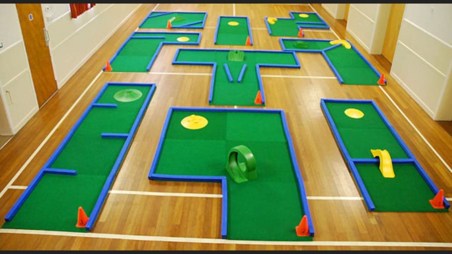 This is our portable 9 Hole Mini Golf, Crazy golf course which comes with 27 meters of playing surface that has a variety of challenges to over come. The crazy golf can be used indoors and outdoors and is suitable for many different events and can be used by children and adults.