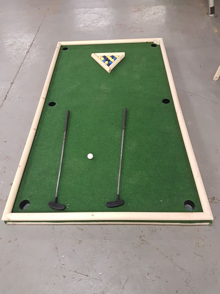 This is our Pool Golf which can be hired on it's own or added to our 9 Hole Crazy Golf/ Mini Golf. Pool golf is a mix of the two games pool and golf, play a game of pool using golf clubs, harder than it sounds! The person to putt all of their golf balls first is the winner. Pool Golf can be used indoors and outdoors and is suitable for many different events and can be used by children and adults.