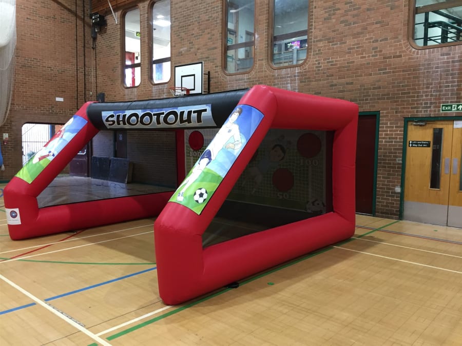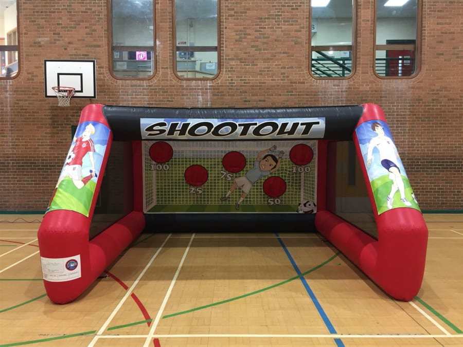 This is our 10x12x8 sports arena penalty shootout which is a classic football game which is suitable for many different events like sports days, football tournament's, team building, school fates and more. The aim of the game is each player gets 3 shots at the shootout to try and get the footballs through the holes in the net at the back which has scores beside each one, the more difficult the shot the higher the score.