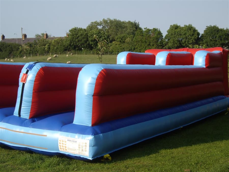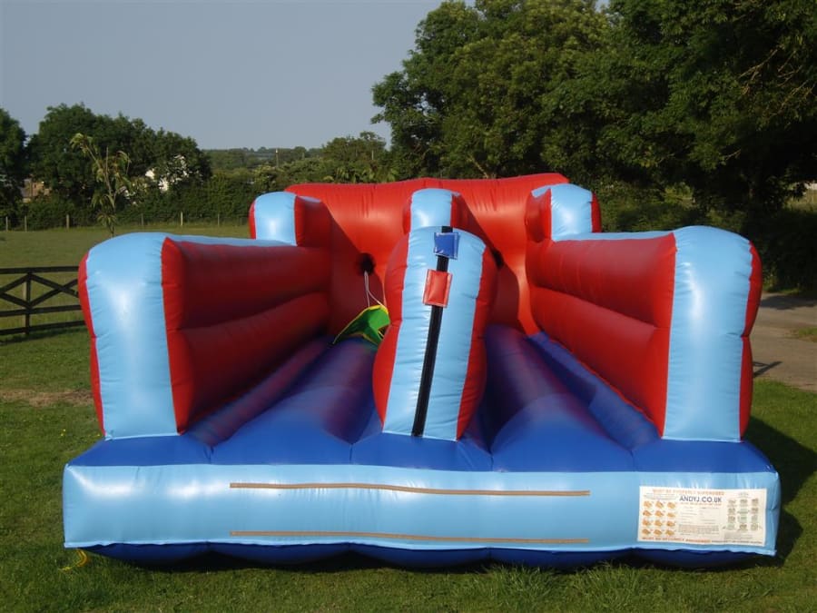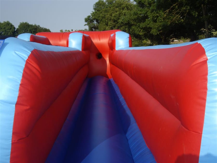 The bungee run is the ultimate race. You and your opponent race to see who can reach the farthest point with a Velcro running baton, then you stick the marker on the side of the inflated wall before the bungee cord that restricts you pulls you back and takes you out of the race. Another crowd pleaser and a must have for any event.