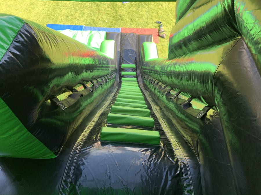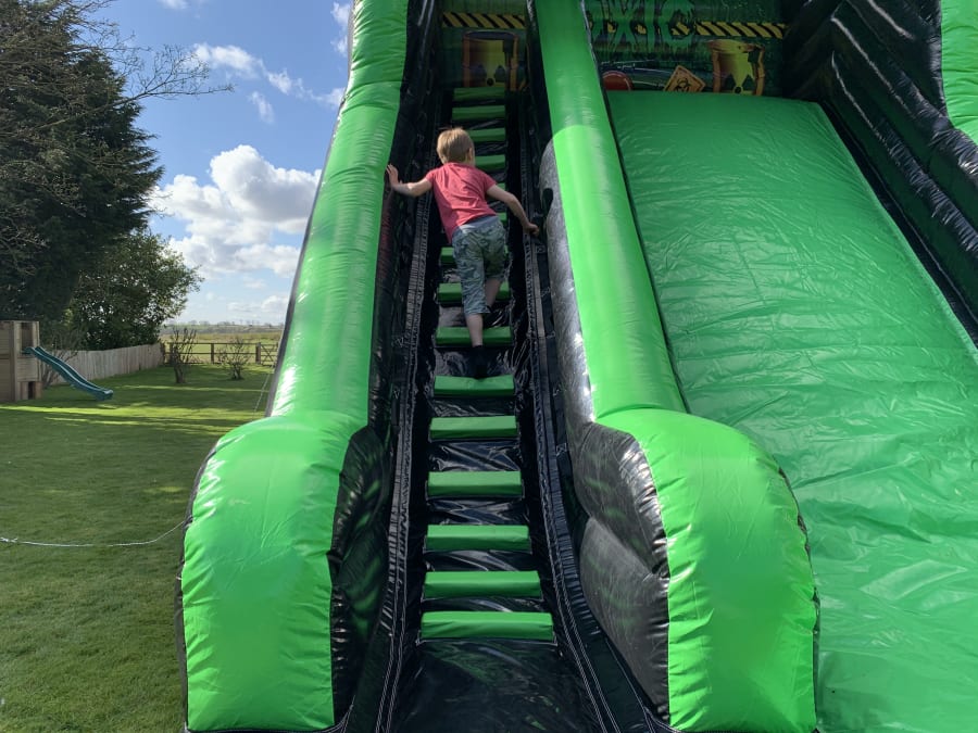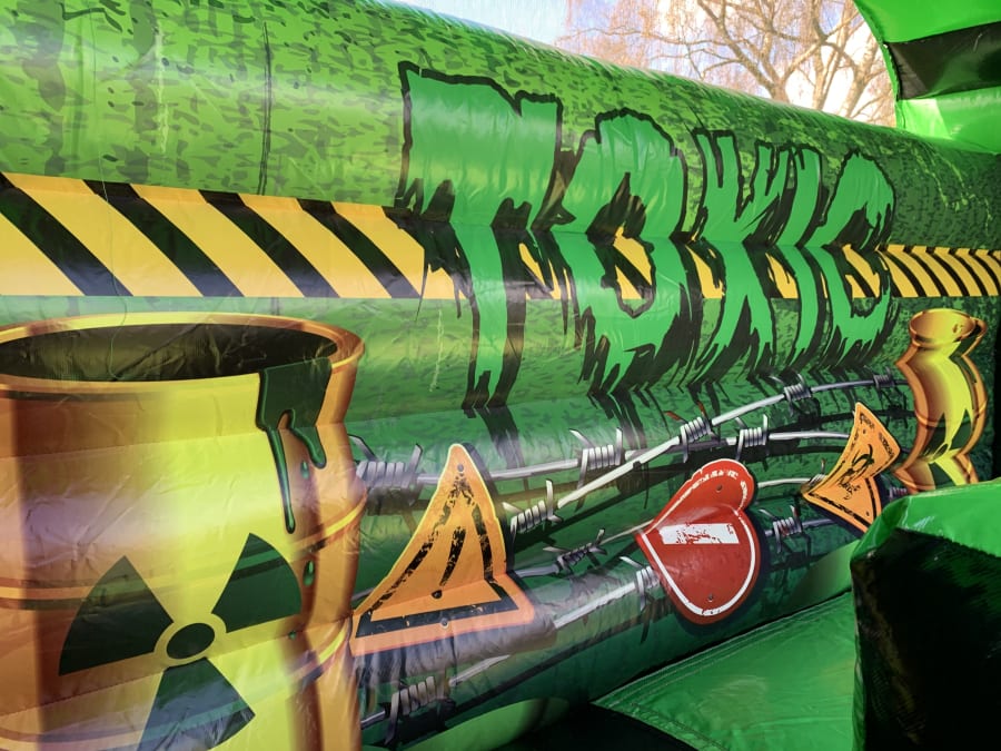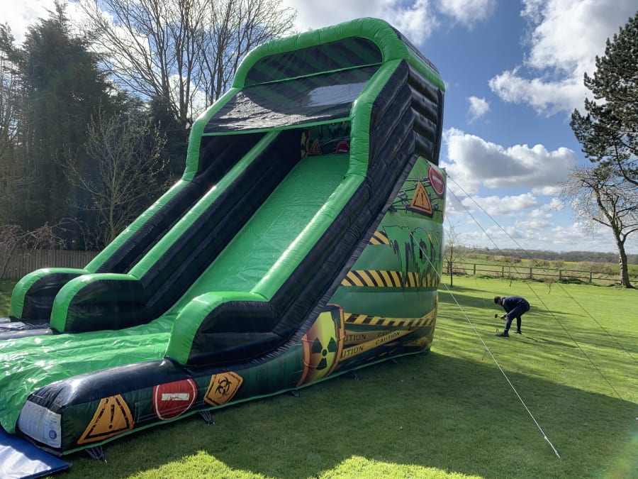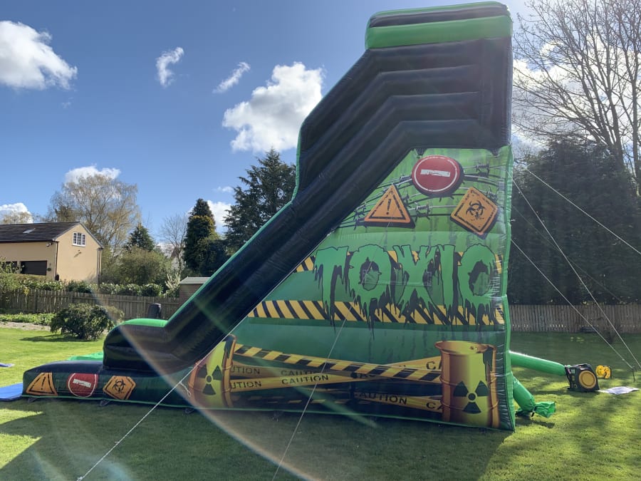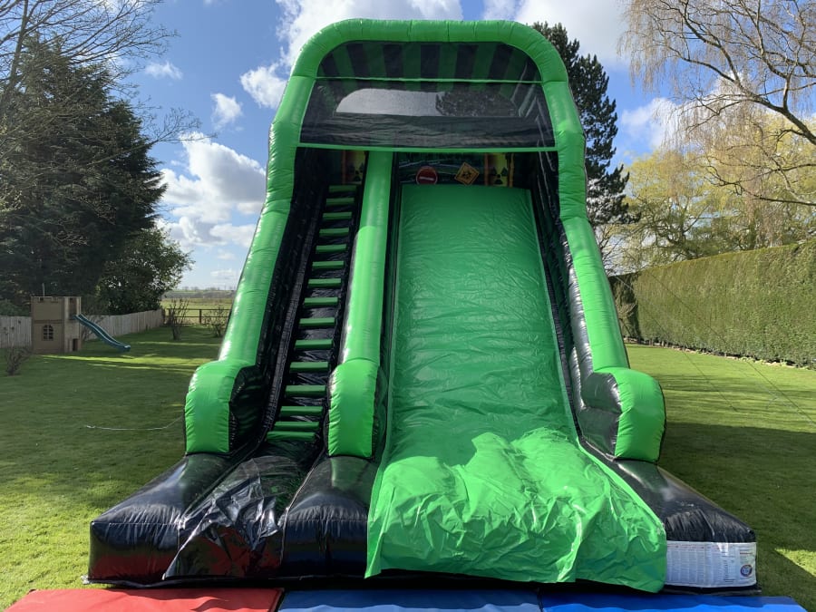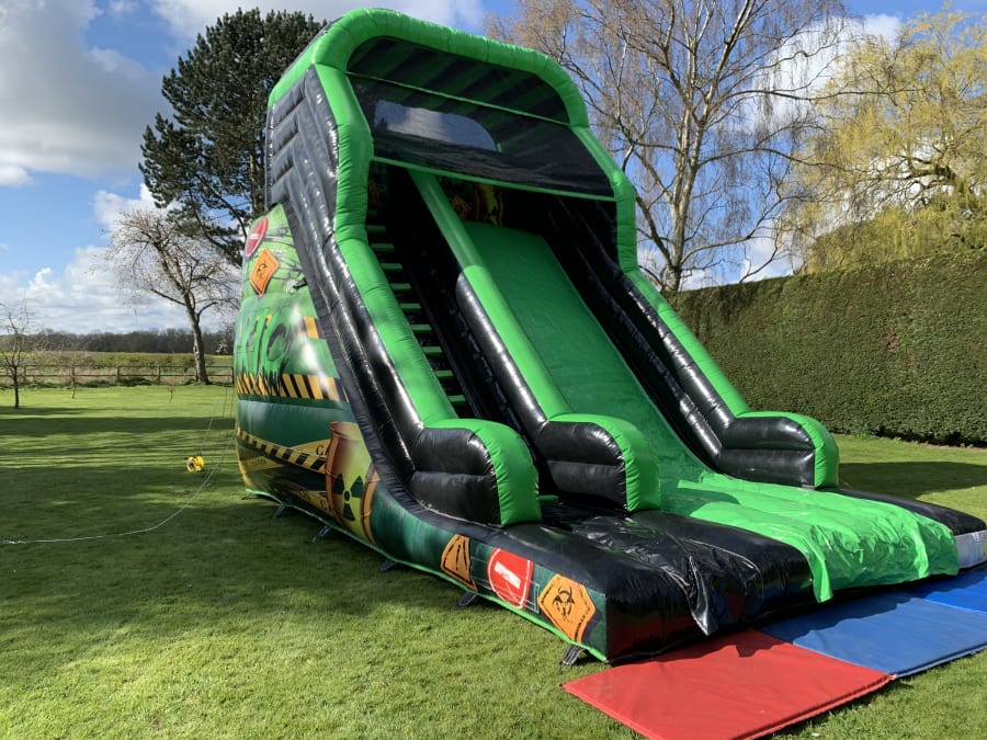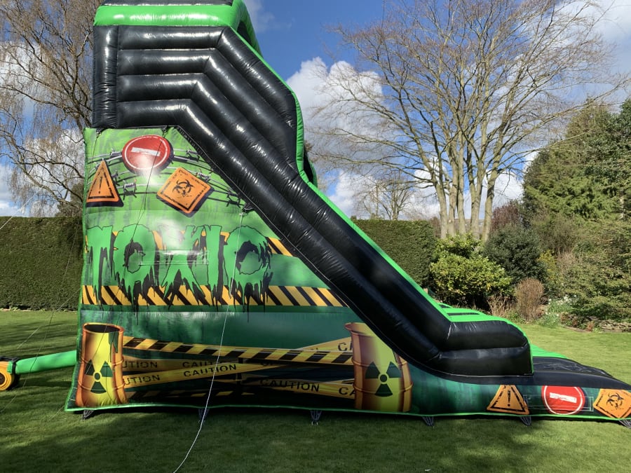 This is our 16x23x25 adult toxic themed mega slide which is suitable for adults and children. It has a platform height of 12ft and stands at 25ft tall. The slide is suitable for many different events including , birthdays, corporate, school fates or even garden hires to name a few.