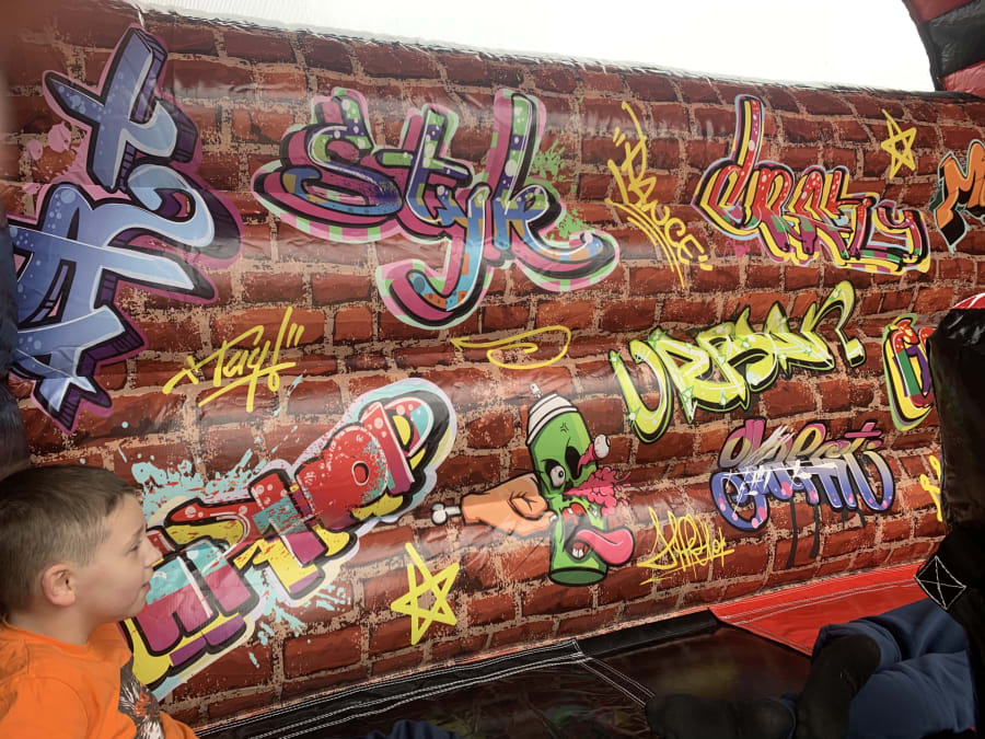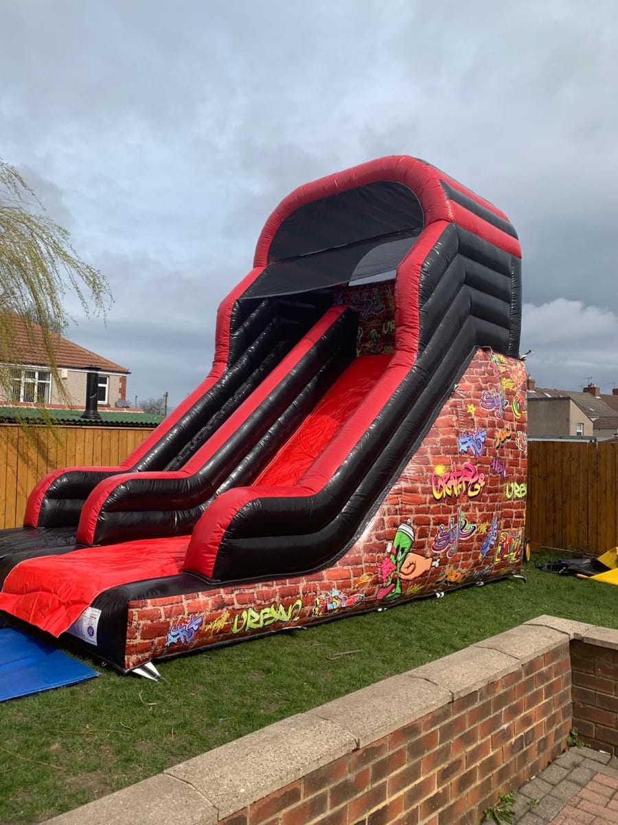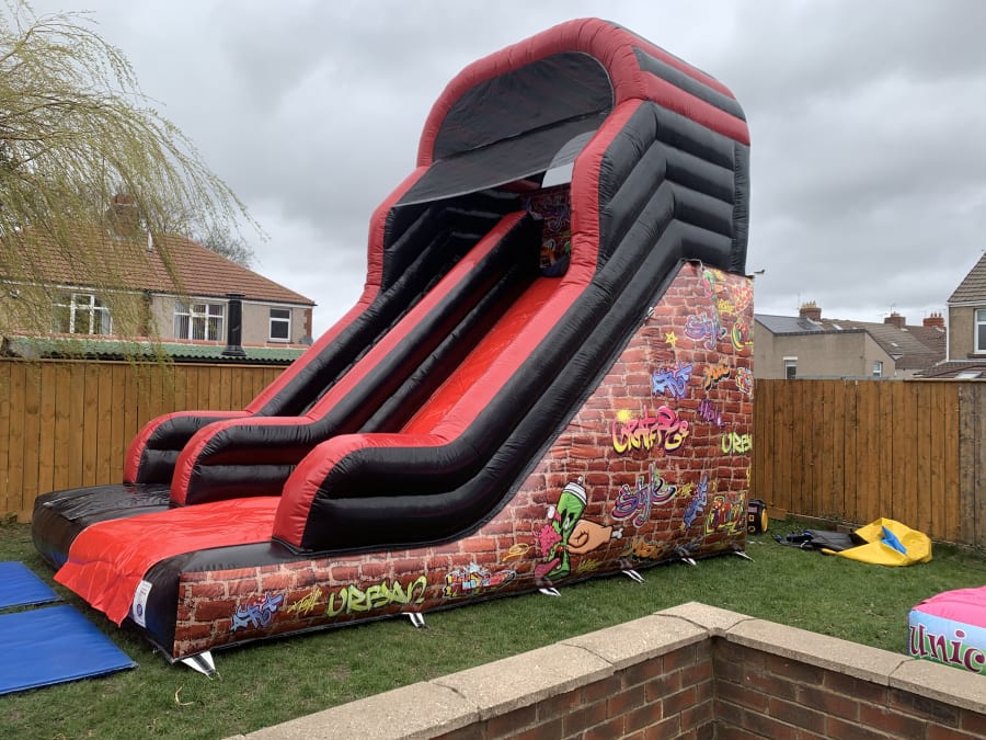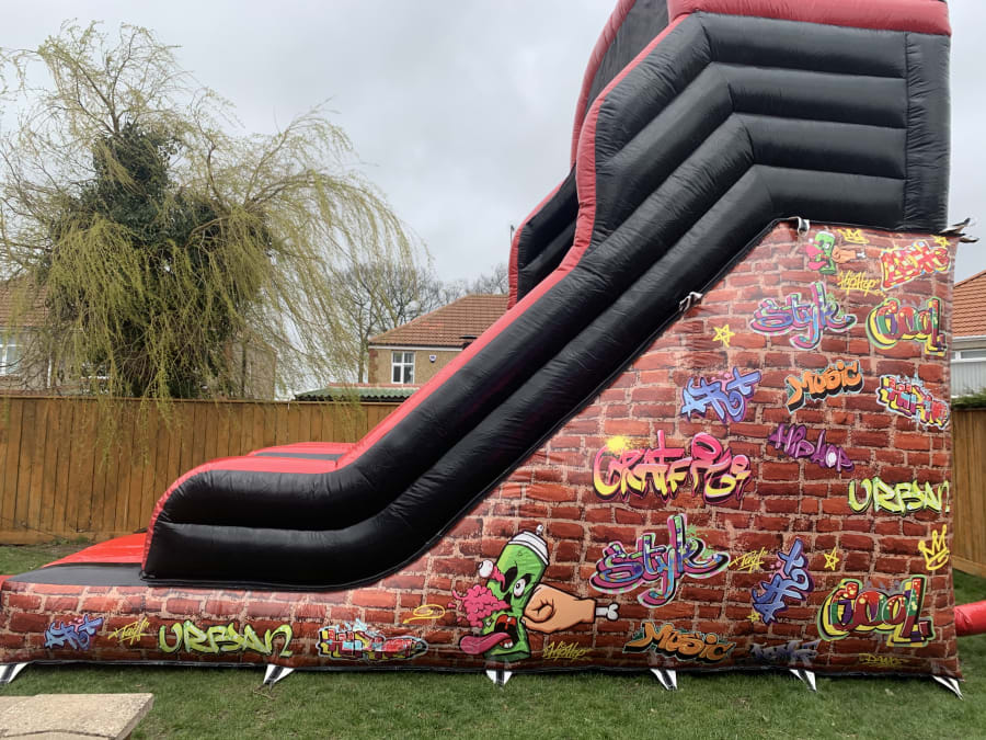 This is another fantastic mega slide we have available to hire at premier bouncy castles, This children's mega slide has vibrant graffiti art work and will go down a treat at many different types of events ranging from birthdays, school fates and fairs or even just a treat for the kids in the back garden.