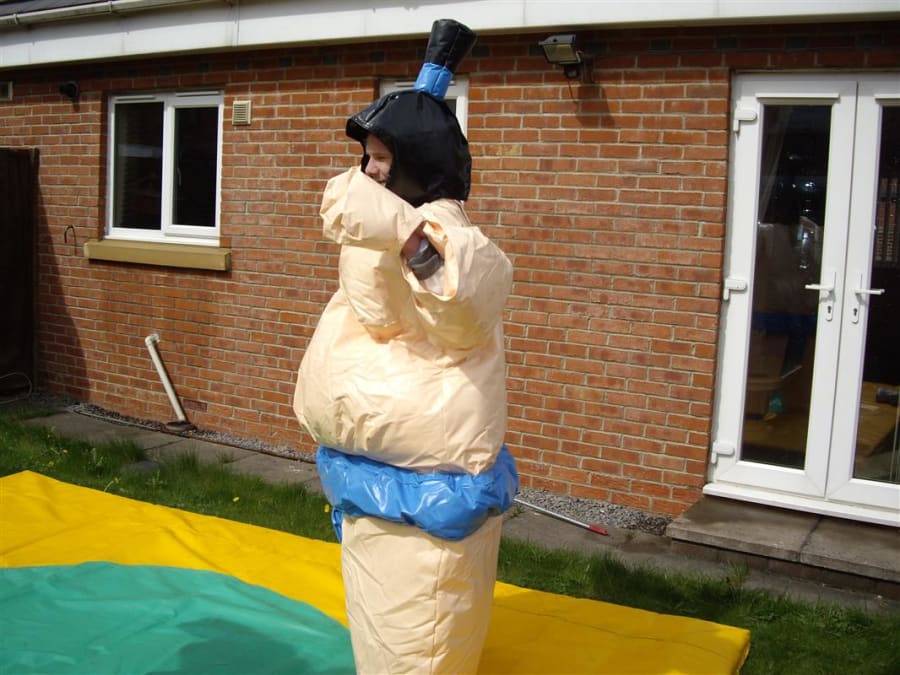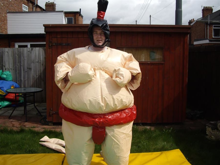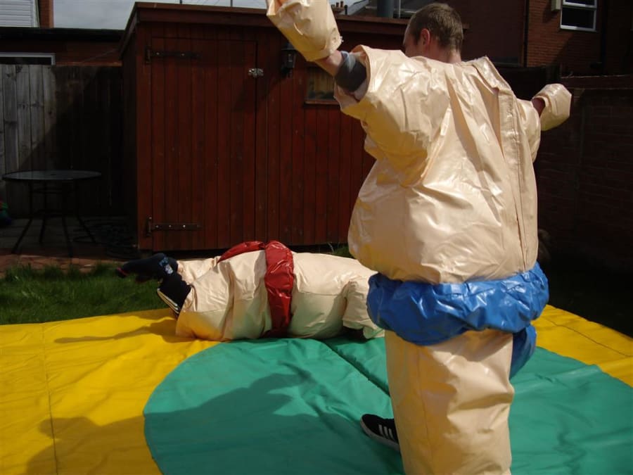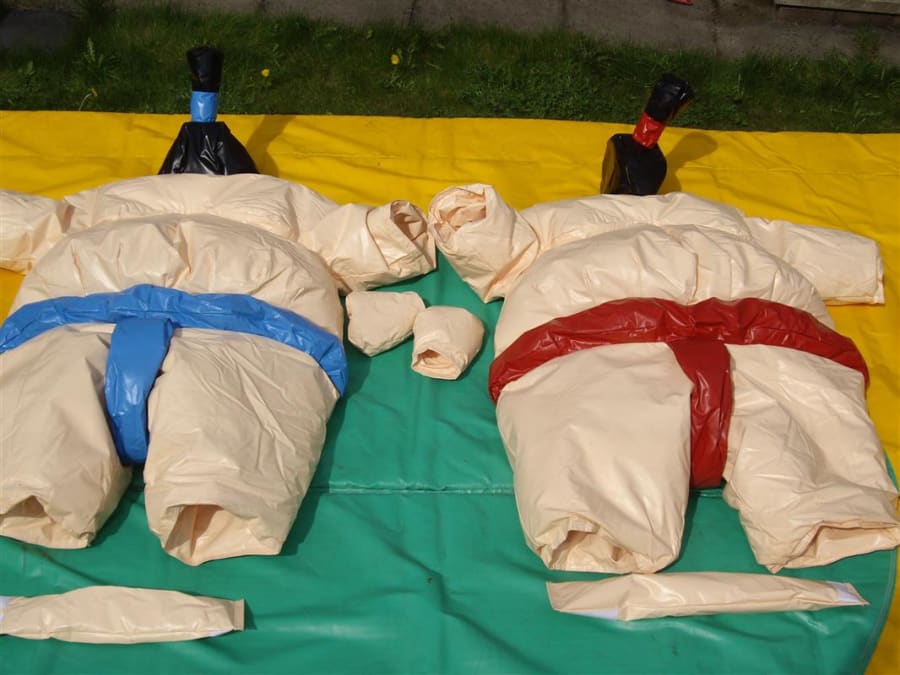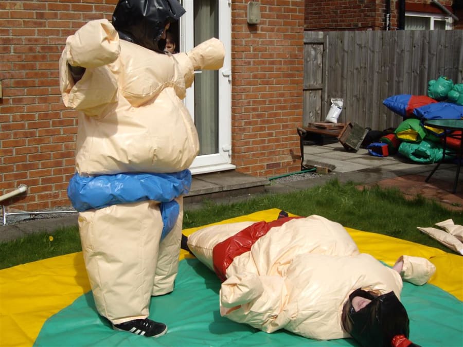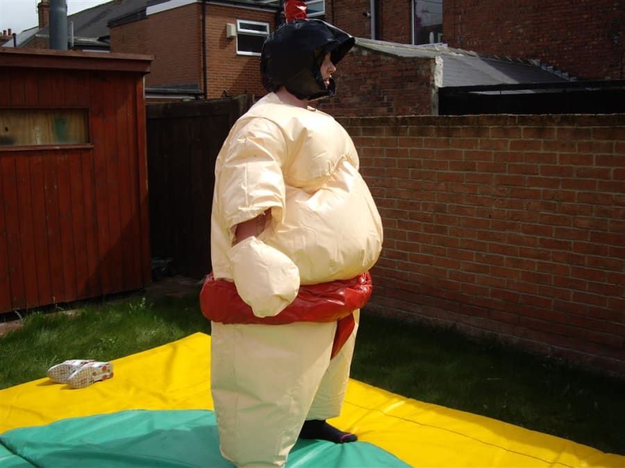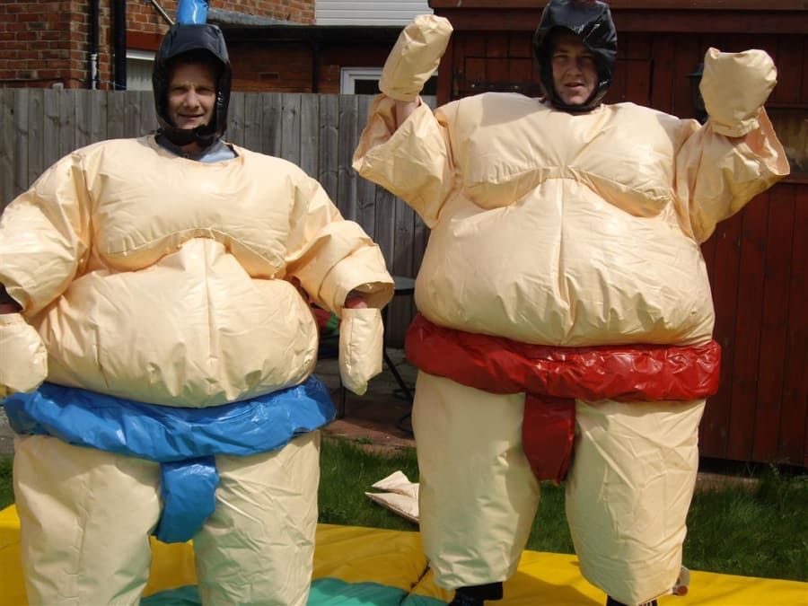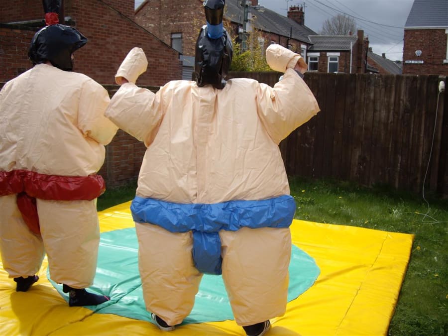 Adult sumo wrestling suits, you could become a champion sumo wrestler without the weight gain but with all the fun. The aim of the game is to push, pull, belly bounce and try with all your strength and whit to get the other sumo out of the circle on the mat or pin them on the floor, this game is as much fun for the spectators as it is for the contestants. So why not give them a go and see if you can be the next sumo champ. What you will get with your hire is 2 sumo suits, 2 helmets, 2 sets of gloves and 1 mat. the age limit for these suits is 12 yrs To 70 years old and are suitable for indoor or outdoor use.